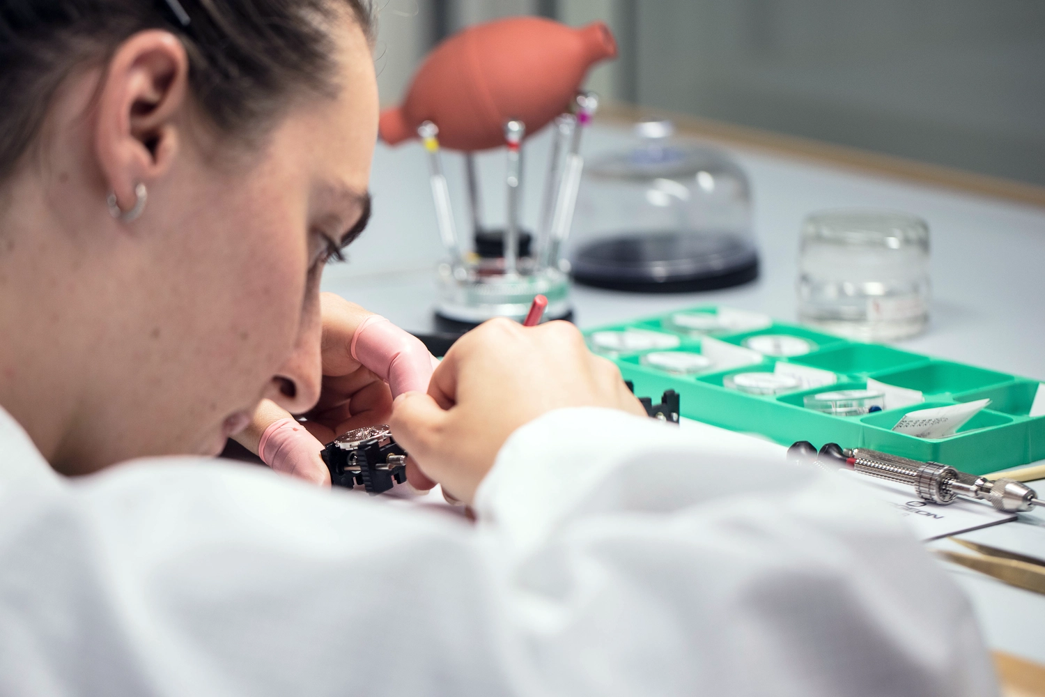 Tu travailles sur un établi dans des ateliers ou des îlots de production horlogère silencieux et bien éclairés.